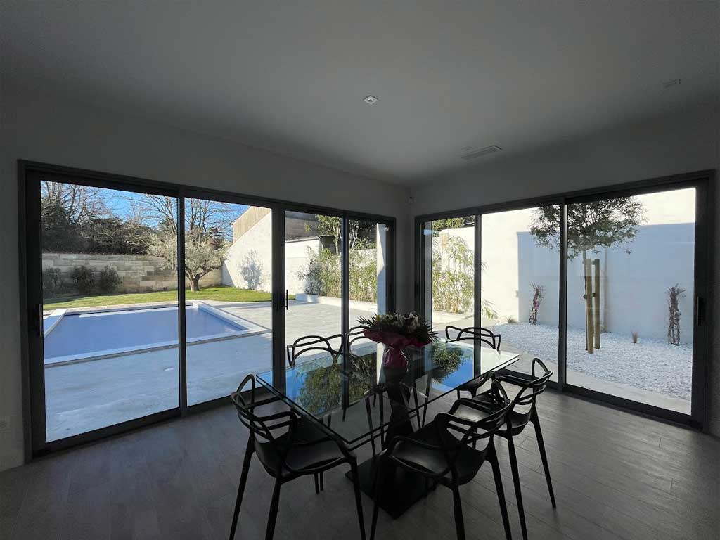 Pour cette maison traditionnelle de village charentais, les équipes multi-spécialistes de Vivanbois ont créé a l’aide d’une extension ossature bois une nouvelle pièce à vivre avec vue sur jardin minéralisé et piscine. L’entreprise a aussi réalisé les finition avec notamment la pose de larges baies vitrées aluminium, et l’habillage de la pièce par un îlot central de cuisine en bois. Cette extension s’intègre dans un projet de rénovation complet de la maison avec changement des menuiseries, reprise du parquet en point de Hongrie du salon, réfection des boiseries des couloirs et séparation d’espace, reprise du plancher bois du 1er étage et de la rambarde. Un prestation alliant tradition et modernité !